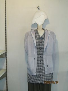 シアーフード付カーデ¥3100 チェックブラウス¥2950 ストレートパンツ¥1500 |