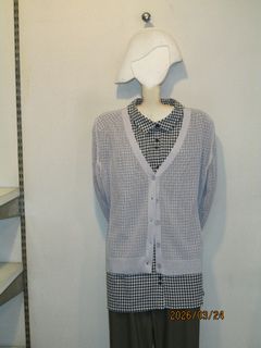 メッシュカーデ¥2480 チェックブラウス¥2950 デニムワイドパンツ¥1900 |